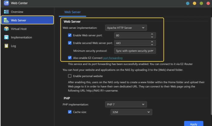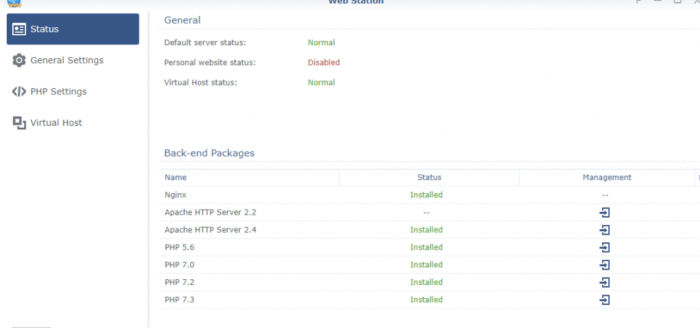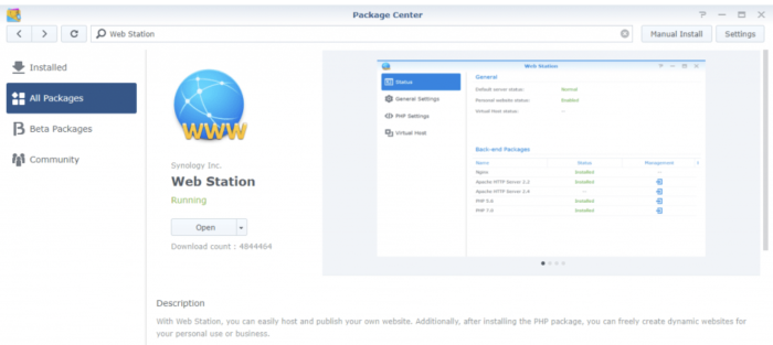 Mặc định Synology DSM sẽ lấy NGINX Server làm Web Server, các bạn có thể tải Apache trên Package Center về để thay thế. Với các bạn có nhu cầu chỉ làm những trang web tĩnh html đơn giản thế là đủ. Các bạn có nhu cầu cao hơn thì tải thêm các gói MariaDBphpMyAdmin, các gói ngôn ngữ lập trình PHP. Để xây dựng các trang Web dùng mã nguồn như: WordPress, phpBB… túm lại là xây dựng các trang web dùng ngôn ngữ lập trình PHP và CSDL là MariaDB – MySQL.