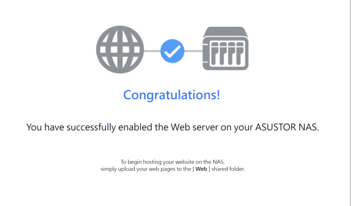 Trang này nằm trong thư mục chia sẻ [Web] của NAS ASUSTOR . Để lưu trữ một trang web trên NAS ASUSTOR, bạn phải tải trang web đó lên thư mục chia sẻ “Web” của NAS.