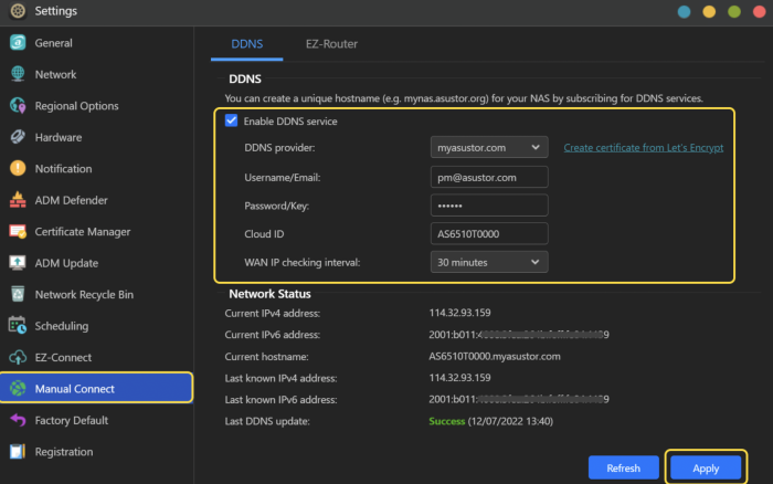 • Trong ADM, nhấp vào [Settings] [Manual Connect] [DDNS].