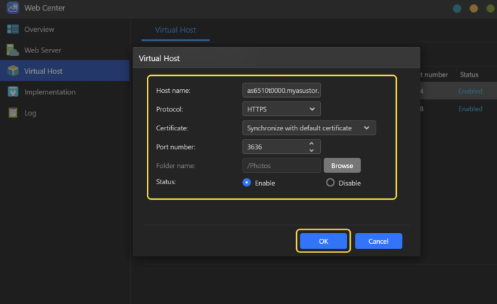 • Cửa sổ Máy chủ ảo sẽ xuất hiện. Điền đầy đủ thông tin vào các trường bắt buộc và nhấp vào  [OK]  khi hoàn tất. Trang web của bạn đã được lưu trữ thành công trên NAS.