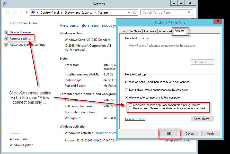 Tại cửa sổ System Properties, chọn Remote Setting, sau đó vào tab “Remote” và bỏ tích chọn “Allow connections only from computers runing Remote Desktop with Network Level Authentication (recommend)”, sau đó nhấn OK để áp cấu hình mới.